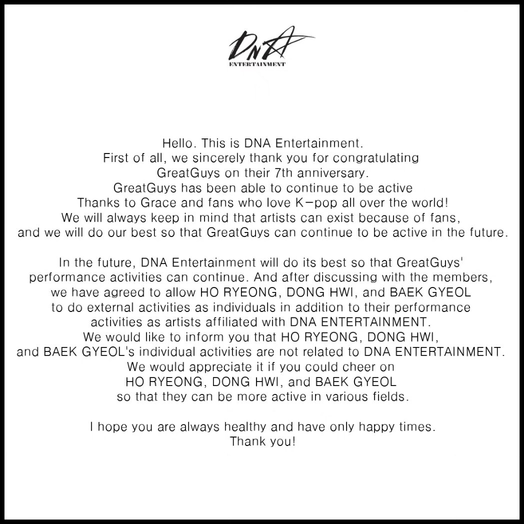 For the 7th anniversary of GREATGUYS, DNA Entertainment, the group's company, released a statement to fans. In this statement, the agency thanks the Graces (the group's fandom name) for their love and support that has allowed the group to continue t…